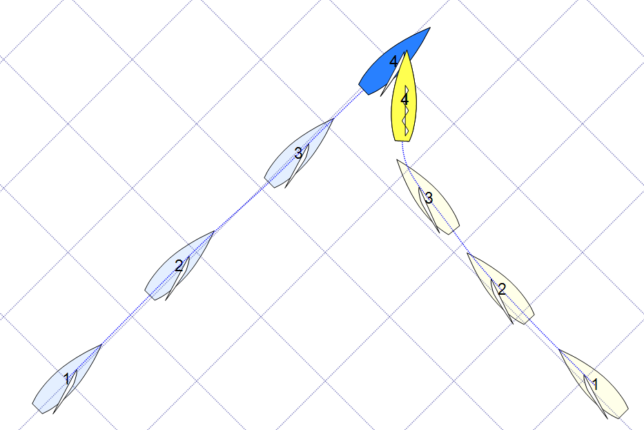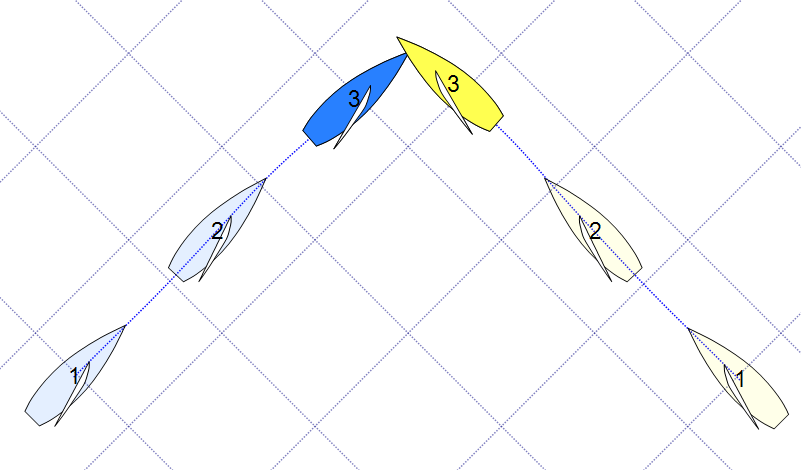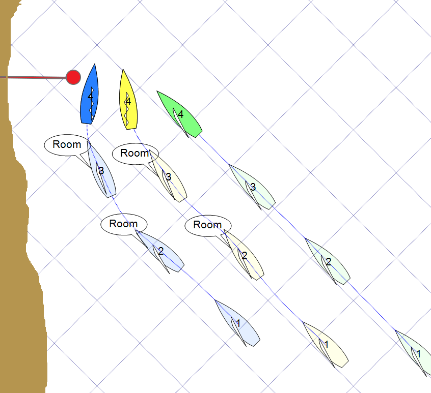 And finally the following scenario. This is unfortunately (mostly) a real situation, but in fairness to the competitors, we won't discuss the details of the protest (the diagram is not from the protest). As the three boats approach an obstruction (a shoreline with a navigational marker), the green boat does not respond to the hails from the other boats. The blue boat is dis-masted after being entangled in the navigational marker. Did green break RRS 2?